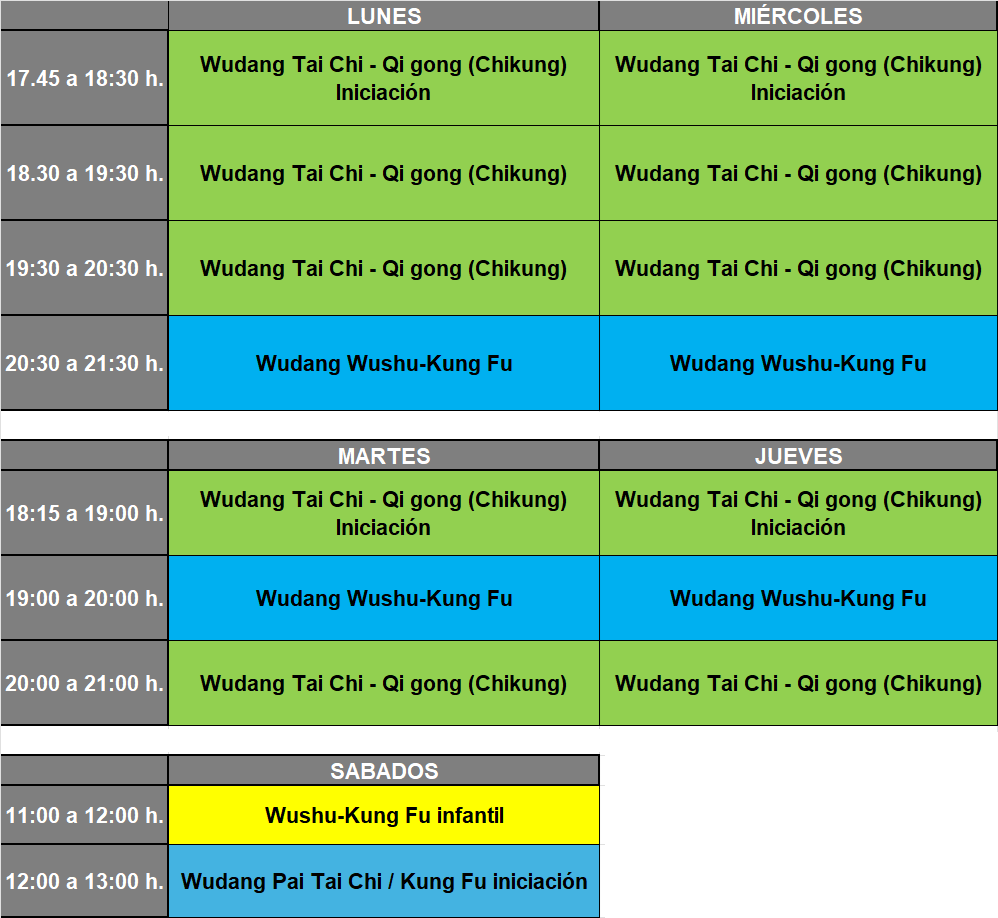A continuación encontrarás los horarios de nuestras clases, Si deseas información sobre las clases, lugar u otras consultas escribir a info@wuxingdao.es o bien en el teléfono 648772030 (llamar o WhatsApp) .